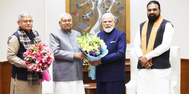 बिहार के मुख्यमंत्री और जनता दल यूनाइटेड (जेडीयू) के नेता नीतीश कुमार ने सोमवार को प्रधानमंत्री नरेंद्र मोदी और गृह मंत्री अमित शाह से मुलाकात की। इन बैठकों का महत्व इसलिए भी अधिक है क्योंकि एक महीने पहले रिकॉर्ड दसवीं बार मुख्यमंत्री के रूप में शपथ लेने के बाद यह दिल्ली की उनकी पहली यात्रा थी। कुमार के साथ उपमुख्यमंत्री सम्राट चौधरी और केंद्रीय मंत्री राजीव रंजन उर्फ ललन सिंह भी थे।